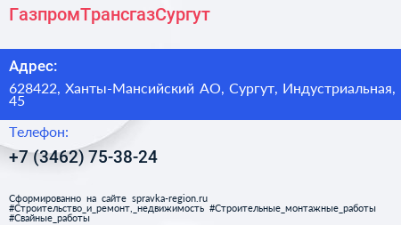 ГазпромТрансгазСургут по адресу 628422, Ханты-Мансийский АО, Сургут, Индустриальная, 45 в дальнейшем Организация, размещена в следующих категориях: