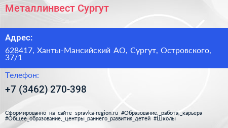 Металлинвест-Сургут по адресу 628417, Ханты-Мансийский АО, Сургут, Островского, 37/1 в дальнейшем Организация, размещена в следующих категориях: