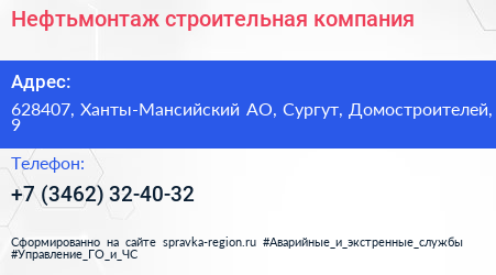 Нефтьмонтаж, строительная компания по адресу 628407, Ханты-Мансийский АО, Сургут, Домостроителей, 9 в дальнейшем Организация, размещена в следующих категориях: