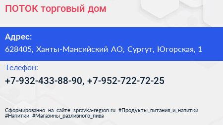 ПОТОК, торговый дом по адресу 628405, Ханты-Мансийский АО, Сургут, Югорская, 1 в дальнейшем Организация, размещена в следующих категориях: