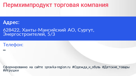 Пермхимпродукт, торговая компания по адресу 628422, Ханты-Мансийский АО, Сургут, Энергостроителей, 5/3 в дальнейшем Организация, размещена в следующих категориях: