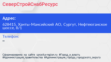 СеверСтройСнабРесурс по адресу 628415, Ханты-Мансийский АО, Сургут, Нефтеюганское шоссе, 8/1 в дальнейшем Организация, размещена в следующих категориях: