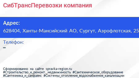 СибТрансПеревозки, компания по адресу 628404, Ханты-Мансийский АО, Сургут, Аэрофлотская, 25 в дальнейшем Организация, размещена в следующих категориях: