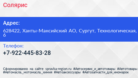 Солярис по адресу 628422, Ханты-Мансийский АО, Сургут, Технологическая, 6 в дальнейшем Организация, размещена в следующих категориях:
