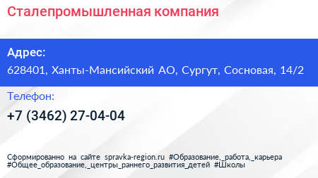 Сталепромышленная компания по адресу 628401, Ханты-Мансийский АО, Сургут, Сосновая, 14/2 в дальнейшем Организация, размещена в следующих категориях: