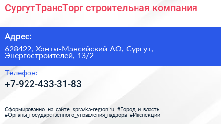 СургутТрансТорг, строительная компания по адресу 628422, Ханты-Мансийский АО, Сургут, Энергостроителей, 13/2 в дальнейшем Организация, размещена в следующих категориях: