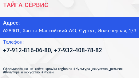 ТАЙГА-СЕРВИС по адресу 628401, Ханты-Мансийский АО, Сургут, Инженерная, 1/3 в дальнейшем Организация, размещена в следующих категориях:
