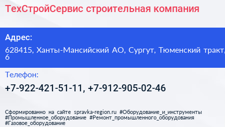 ТехСтройСервис, строительная компания по адресу 628415, Ханты-Мансийский АО, Сургут, Тюменский тракт, 6 в дальнейшем Организация, размещена в следующих категориях: