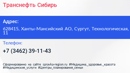 Транснефть-Сибирь по адресу 628415, Ханты-Мансийский АО, Сургут, Технологическая, 11 в дальнейшем Организация, размещена в следующих категориях: