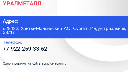 УРАЛМЕТАЛЛ по адресу 628422, Ханты-Мансийский АО, Сургут, Индустриальная, 38/1т в дальнейшем Организация, размещена в следующих категориях: