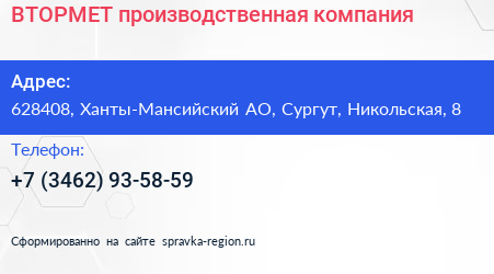 ВТОРМЕТ, производственная компания по адресу 628408, Ханты-Мансийский АО, Сургут, Никольская, 8 в дальнейшем Организация, размещена в следующих категориях: