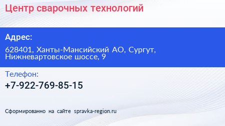 Центр сварочных технологий по адресу 628401, Ханты-Мансийский АО, Сургут, Нижневартовское шоссе, 9 в дальнейшем Организация, размещена в следующих категориях: