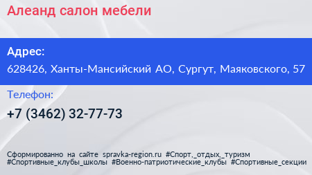 Алеанд, салон мебели по адресу 628426, Ханты-Мансийский АО, Сургут, Маяковского, 57 в дальнейшем Организация, размещена в следующих категориях: