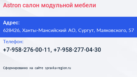 Astron, салон модульной мебели по адресу 628426, Ханты-Мансийский АО, Сургут, Маяковского, 57 в дальнейшем Организация, размещена в следующих категориях: