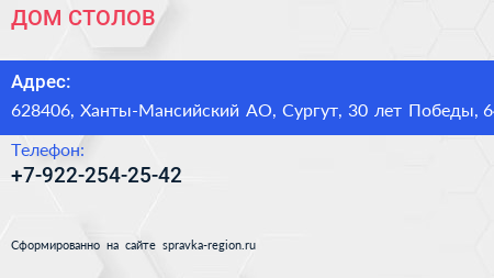 ДОМ СТОЛОВ по адресу 628406, Ханты-Мансийский АО, Сургут, 30 лет Победы, 64 в дальнейшем Организация, размещена в следующих категориях: