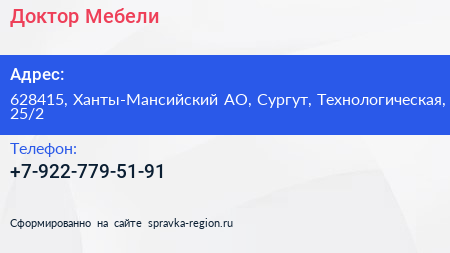 Доктор Мебели по адресу 628415, Ханты-Мансийский АО, Сургут, Технологическая, 25/2 в дальнейшем Организация, размещена в следующих категориях: