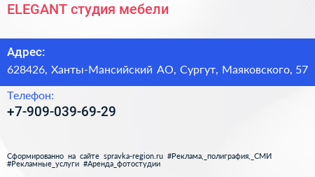 ELEGANT, студия мебели по адресу 628426, Ханты-Мансийский АО, Сургут, Маяковского, 57 в дальнейшем Организация, размещена в следующих категориях: