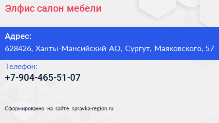 Элфис, салон мебели по адресу 628426, Ханты-Мансийский АО, Сургут, Маяковского, 57 в дальнейшем Организация, размещена в следующих категориях: