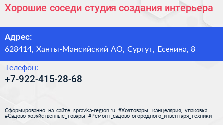 Хорошие соседи, студия создания интерьера по адресу 628414, Ханты-Мансийский АО, Сургут, Есенина, 8 в дальнейшем Организация, размещена в следующих категориях: