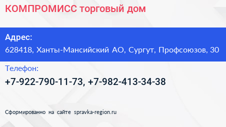 КОМПРОМИСС, торговый дом по адресу 628418, Ханты-Мансийский АО, Сургут, Профсоюзов, 30 в дальнейшем Организация, размещена в следующих категориях: