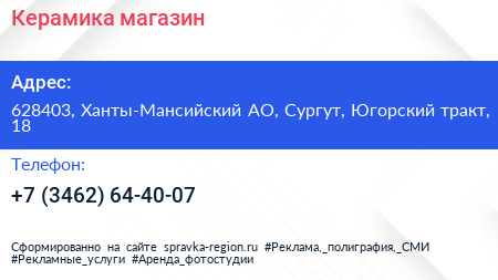 Керамика, магазин по адресу 628403, Ханты-Мансийский АО, Сургут, Югорский тракт, 18 в дальнейшем Организация, размещена в следующих категориях: