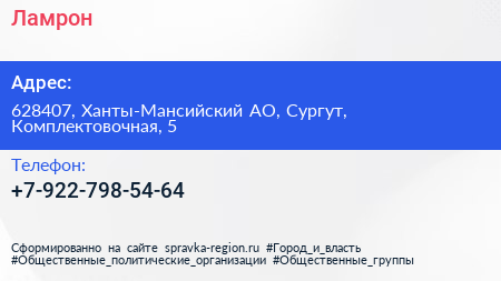 Ламрон по адресу 628407, Ханты-Мансийский АО, Сургут, Комплектовочная, 5 в дальнейшем Организация, размещена в следующих категориях: