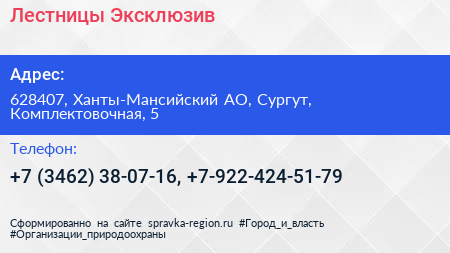 Лестницы Эксклюзив по адресу 628407, Ханты-Мансийский АО, Сургут, Комплектовочная, 5 в дальнейшем Организация, размещена в следующих категориях: