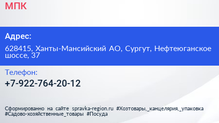 МПК по адресу 628415, Ханты-Мансийский АО, Сургут, Нефтеюганское шоссе, 37 в дальнейшем Организация, размещена в следующих категориях: