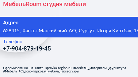МебельRoom, студия мебели по адресу 628415, Ханты-Мансийский АО, Сургут, Игоря Киртбая, 19 в дальнейшем Организация, размещена в следующих категориях: