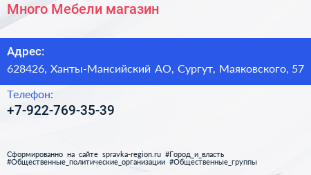 Много Мебели, магазин по адресу 628426, Ханты-Мансийский АО, Сургут, Маяковского, 57 в дальнейшем Организация, размещена в следующих категориях: