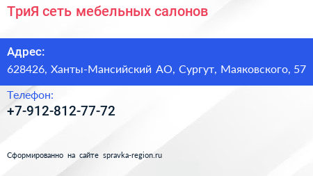 ТриЯ, сеть мебельных салонов по адресу 628426, Ханты-Мансийский АО, Сургут, Маяковского, 57 в дальнейшем Организация, размещена в следующих категориях: