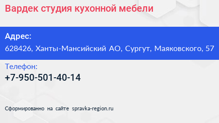 Вардек, студия кухонной мебели по адресу 628426, Ханты-Мансийский АО, Сургут, Маяковского, 57 в дальнейшем Организация, размещена в следующих категориях: