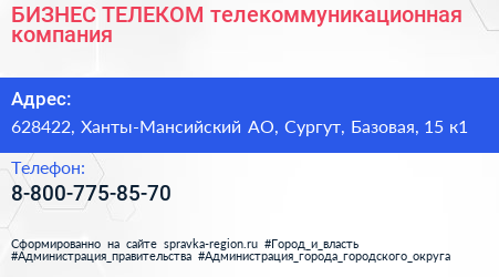 БИЗНЕС ТЕЛЕКОМ, телекоммуникационная компания по адресу 628422, Ханты-Мансийский АО, Сургут, Базовая, 15 к1 в дальнейшем Организация, размещена в следующих категориях: