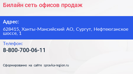 Билайн, сеть офисов продаж по адресу 628415, Ханты-Мансийский АО, Сургут, Нефтеюганское шоссе, 1 в дальнейшем Организация, размещена в следующих категориях: