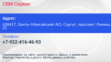 CRM Сервис по адресу 628417, Ханты-Мансийский АО, Сургут, проспект Ленина, 21 в дальнейшем Организация, размещена в следующих категориях: