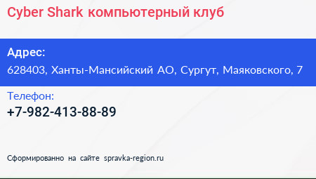 Cyber Shark, компьютерный клуб по адресу 628403, Ханты-Мансийский АО, Сургут, Маяковского, 7 в дальнейшем Организация, размещена в следующих категориях: