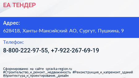 ЕА ТЕНДЕР по адресу 628418, Ханты-Мансийский АО, Сургут, Пушкина, 9 в дальнейшем Организация, размещена в следующих категориях: