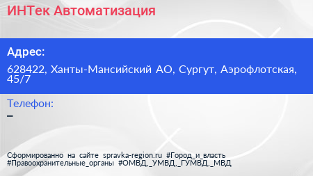 ИНТек-Автоматизация по адресу 628422, Ханты-Мансийский АО, Сургут, Аэрофлотская, 45/7 в дальнейшем Организация, размещена в следующих категориях: