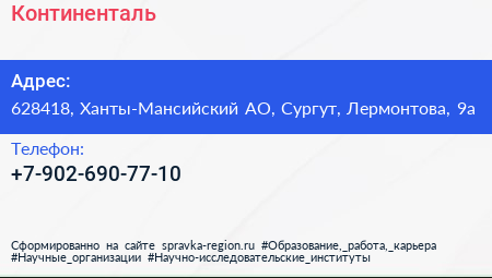 Континенталь по адресу 628418, Ханты-Мансийский АО, Сургут, Лермонтова, 9а в дальнейшем Организация, размещена в следующих категориях: