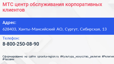 МТС, центр обслуживания корпоративных клиентов по адресу 628403, Ханты-Мансийский АО, Сургут, Сибирская, 13 в дальнейшем Организация, размещена в следующих категориях: