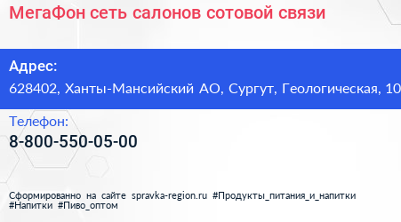 МегаФон, сеть салонов сотовой связи по адресу 628402, Ханты-Мансийский АО, Сургут, Геологическая, 10 в дальнейшем Организация, размещена в следующих категориях:
