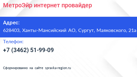 МетроЭйр, интернет-провайдер по адресу 628403, Ханты-Мансийский АО, Сургут, Маяковского, 21а в дальнейшем Организация, размещена в следующих категориях:
