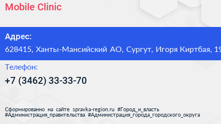 Mobile Clinic по адресу 628415, Ханты-Мансийский АО, Сургут, Игоря Киртбая, 19 в дальнейшем Организация, размещена в следующих категориях: