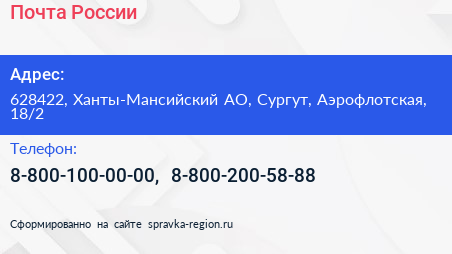 Почта России по адресу 628422, Ханты-Мансийский АО, Сургут, Аэрофлотская, 18/2 в дальнейшем Организация, размещена в следующих категориях: