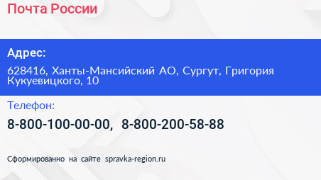 Почта России по адресу 628416, Ханты-Мансийский АО, Сургут, Григория Кукуевицкого, 10 в дальнейшем Организация, размещена в следующих категориях: