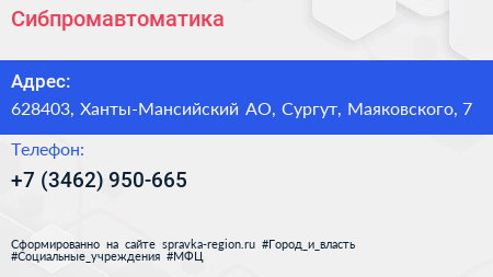 Сибпромавтоматика по адресу 628403, Ханты-Мансийский АО, Сургут, Маяковского, 7 в дальнейшем Организация, размещена в следующих категориях: