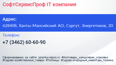 СофтСервисПроф, IT-компания по адресу 628408, Ханты-Мансийский АО, Сургут, Энергетиков, 20 в дальнейшем Организация, размещена в следующих категориях: