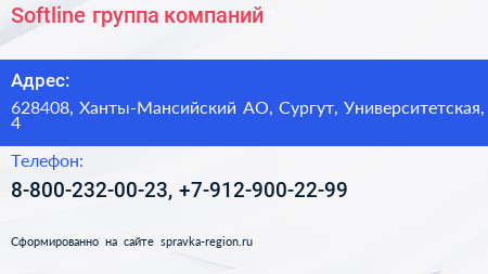 Softline, группа компаний по адресу 628408, Ханты-Мансийский АО, Сургут, Университетская, 4 в дальнейшем Организация, размещена в следующих категориях: