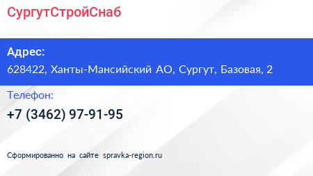 СургутСтройСнаб по адресу 628422, Ханты-Мансийский АО, Сургут, Базовая, 2 в дальнейшем Организация, размещена в следующих категориях:
