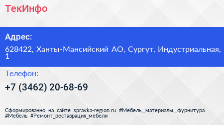 ТекИнфо по адресу 628422, Ханты-Мансийский АО, Сургут, Индустриальная, 1 в дальнейшем Организация, размещена в следующих категориях: